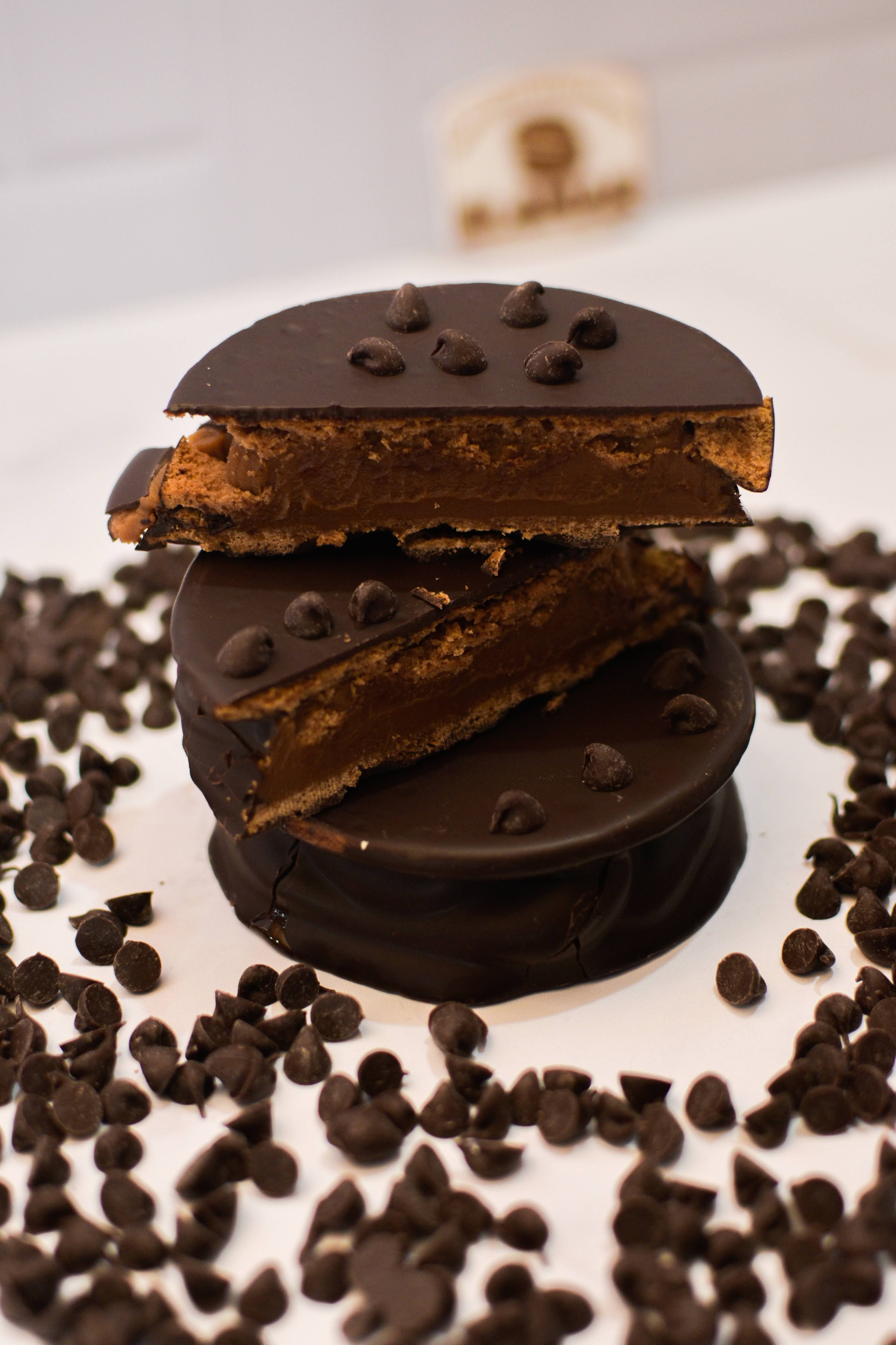 Alfajor gigante de dulce de leche bañado en chocolate semiamargo